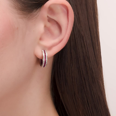 Серьги с 120 бриллиантами природными, 0.32 карат, огранка круг 17 граней, цвет 2, чистота 2, тип огранки А; 46 рубинами природными, 0.53 карат, цвет 2, чистота 2, тип огранки В; Белое золото 585 пробы.
