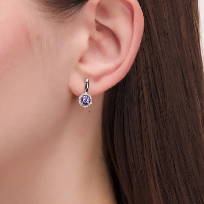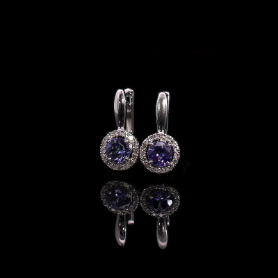 Серьги с 32 бриллиантами природными, 0.2 карат, огранка круг 17 граней, цвет 2, чистота 2, тип огранки А; 2 танзанитами природными, 0.98 карат; Белое золото 585 пробы.