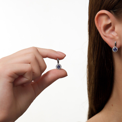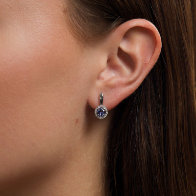 Серьги с 32 бриллиантами природными, 0.2 карат, огранка круг 17 граней, цвет 2, чистота 2, тип огранки А; 2 танзанитами природными, 1 карат; Белое золото 585 пробы.