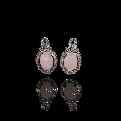 Серьги с 62 бриллиантами природными, 0.13 карат, огранка круг 17 граней, цвет 2, чистота 2, тип огранки А; 2 кварцами розовыми природными, 2.88 карат; Розовое золото 585 пробы.