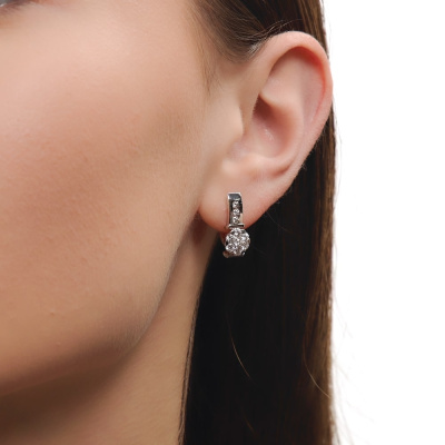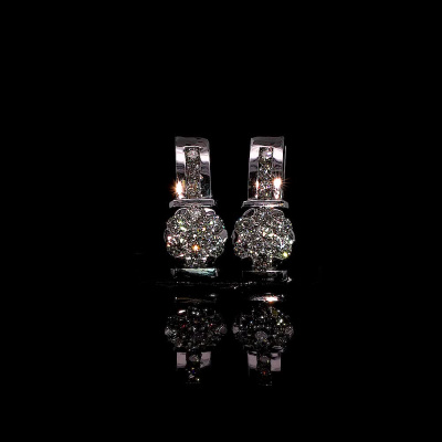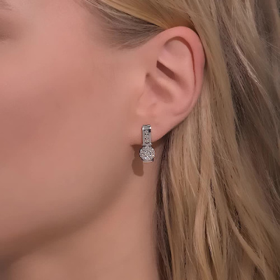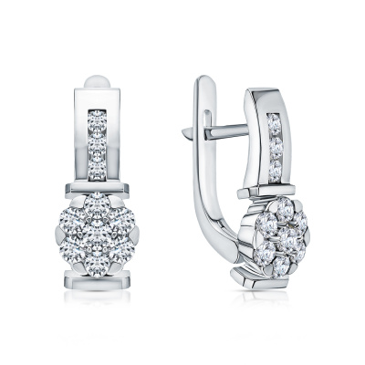 Серьги с 2 бриллиантами природными, 0.13 карат, огранка круг 57 граней, цвет 4, чистота 5, тип огранки А; 12 бриллиантами природными, 0.6 карат, огранка круг 57 граней, цвет 4, чистота 5, тип огранки А; 6 бриллиантами природными, 0.19 карат, огранка круг 57 граней, цвет 4, чистота 5, тип огранки А; Белое золото 585 пробы.