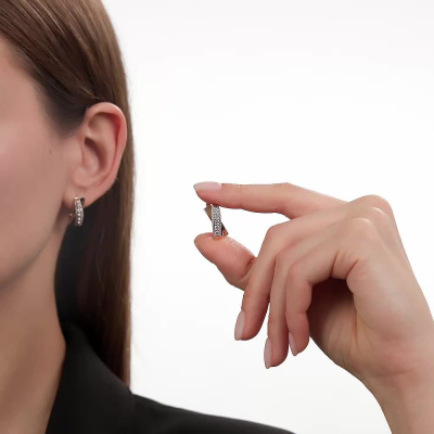 Серьги с 10 бриллиантами природными, 0.61 карат, огранка круг 57 граней, цвет 3, чистота 6, тип огранки А; 68 бриллиантами природными, 0.14 карат, огранка круг 17 граней, цвет 2, чистота 2, тип огранки А; Розовое золото 585 пробы.