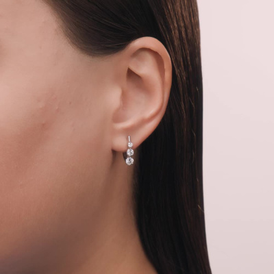 Серьги с 2 бриллиантами природными, 0.5 карат, огранка круг 57 граней, цвет 3, чистота 6, тип огранки А; 2 бриллиантами природными, 0.32 карат, огранка круг 57 граней, цвет 3, чистота 6, тип огранки А; 2 бриллиантами природными, 0.11 карат, огранка круг 57 граней, цвет 3, чистота 6, тип огранки А; Белое золото 585 пробы.