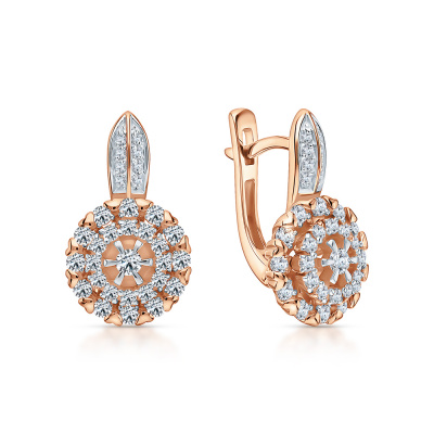Серьги с 2 бриллиантами природными, 0.07 карат, огранка круг 57 граней, цвет 3, чистота 6, тип огранки А; 24 бриллиантами природными, 0.35 карат, огранка круг 57 граней, цвет 3, чистота 6, тип огранки А; 24 бриллиантами природными, 0.2 карат, огранка круг 57 граней, цвет 3, чистота 6, тип огранки А; 16 бриллиантами природными, 0.06 карат, огранка круг 17 граней, цвет 2, чистота 2, тип огранки А; Розовое и белое золото 585 пробы.