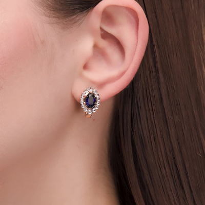 Серьги с 4 бриллиантами природными, 0.05 карат, огранка круг 57 граней, цвет 3, чистота 6, тип огранки А; 8 бриллиантами природными, 0.05 карат, огранка круг 57 граней, цвет 3, чистота 6, тип огранки А; 16 бриллиантами природными, 0.05 карат, огранка круг 17 граней, цвет 2, чистота 2, тип огранки А; 2 сапфирами синтетическими, 2.88 карат; Розовое золото 585 пробы.