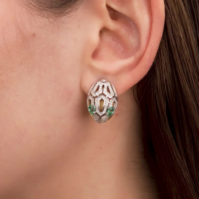 Серьги с 232 бриллиантами природными, 0.51 карат, огранка круг 17 граней, цвет 2, чистота 2, тип огранки А; 4 изумрудами природными, 0.67 карат, цвет 3, чистота 3, тип огранки Б; Желтое золото 585 пробы.