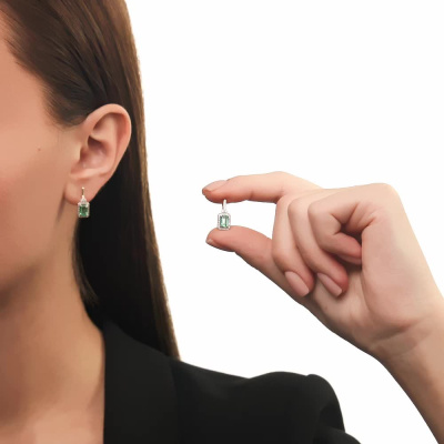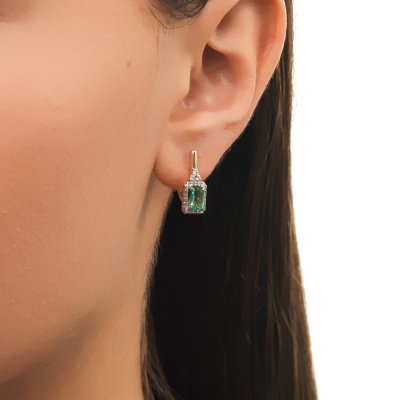 Серьги с 6 бриллиантами природными, 0.08 карат, огранка круг 57 граней, цвет 3, чистота 6, тип огранки А; 40 бриллиантами природными, 0.14 карат, огранка круг 17 граней, цвет 2, чистота 2, тип огранки А; 2 изумрудами природными, 0.98 карат, цвет 4, чистота 3, тип огранки Б; Желтое золото 585 пробы.
