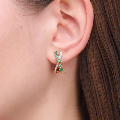 Серьги с 18 бриллиантами природными, 0.04 карат, огранка круг 17 граней, цвет 2, чистота 2, тип огранки А; 10 изумрудами природными, 0.89 карат, цвет 3, чистота 3, тип огранки В; Розовое золото 585 пробы.