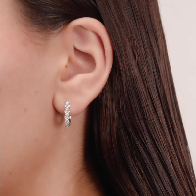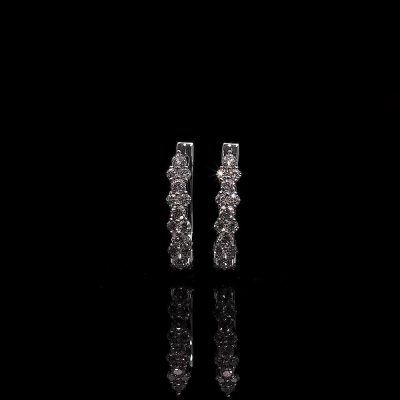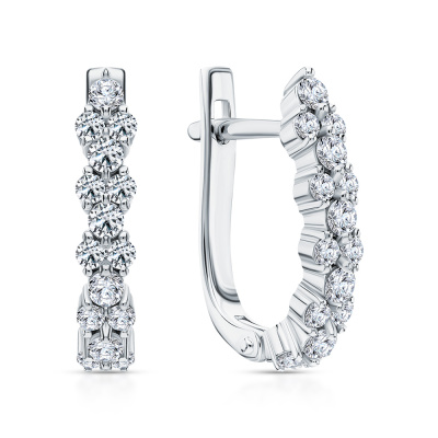 Серьги с 10 бриллиантами природными, 0.3 карат, огранка круг 57 граней, цвет 4, чистота 5, тип огранки А; 20 бриллиантами природными, 0.29 карат, огранка круг 57 граней, цвет 4, чистота 5, тип огранки А; Белое золото 585 пробы.