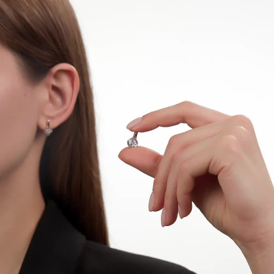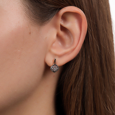 Серьги с 2 бриллиантами природными, 0.01 карат, огранка круг 57 граней, цвет 3, чистота 6; 16 бриллиантами природными, 0.06 карат, огранка круг 17 граней, цвет 2, чистота 2; Розовое и белое золото 585 пробы.