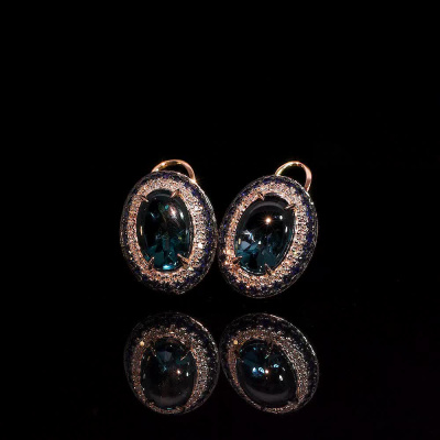 Серьги с 56 бриллиантами природными, 0.22 карат, огранка круг 17 граней, цвет 2, чистота 2, тип огранки А; 2 топазами лондон природными, 5.03 карат, тип огранки Б; 52 сапфирами природными, 0.55 карат, цвет 2, чистота 2, тип огранки В; Розовое золото 585 пробы.