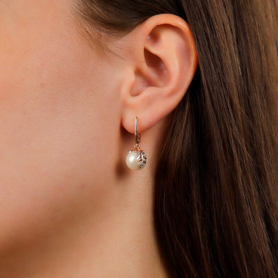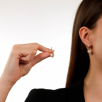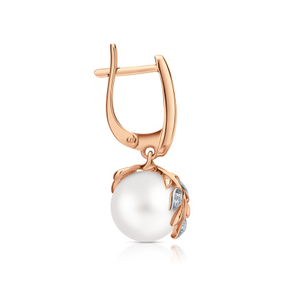 Серьги с 6 бриллиантами природными, 0.02 карат, огранка круг 17 граней, цвет 2, чистота 2, тип огранки А; 6 бриллиантами природными, 0.01 карат, огранка круг 17 граней, цвет 2, чистота 2, тип огранки А; 2 жемчугами пресноводными культ.белыми; Розовое золото 585 пробы.
