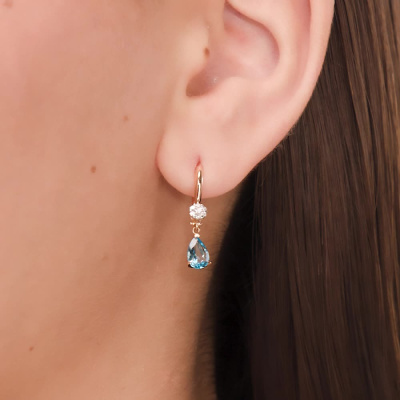 Серьги с 14 бриллиантами природными, 0.1 карат, огранка круг 17 граней, цвет 2, чистота 2, тип огранки А; 2 топазами свисс природными, 1.43 карат; Розовое золото 585 пробы.