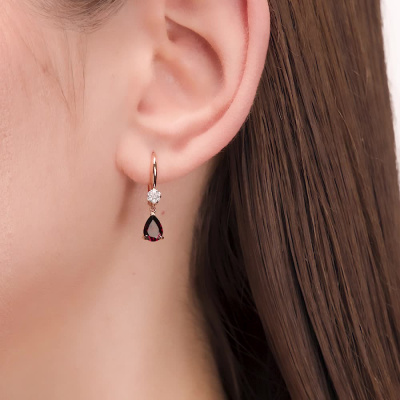 Серьги с 14 бриллиантами природными, 0.1 карат, огранка круг 17 граней, цвет 2, чистота 2, тип огранки А; 2 гранатами природными, 1.62 карат; Розовое золото 585 пробы.