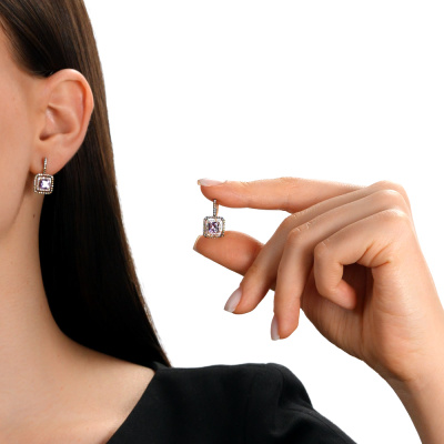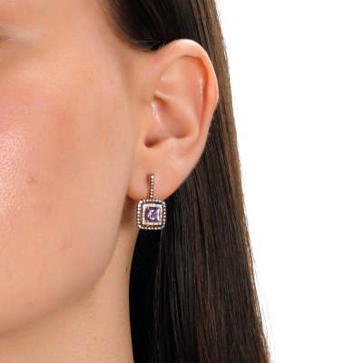 Серьги с 48 бриллиантами природными, 0.1 карат, огранка круг 17 граней, цвет 2, чистота 2, тип огранки А; 2 аметистами природными, 1.18 карат; 70 бриллиантами коньячными природными, 0.27 карат, огранка круг 57 граней, цвет 7, чистота 5, тип огранки А; Розовое золото 585 пробы.