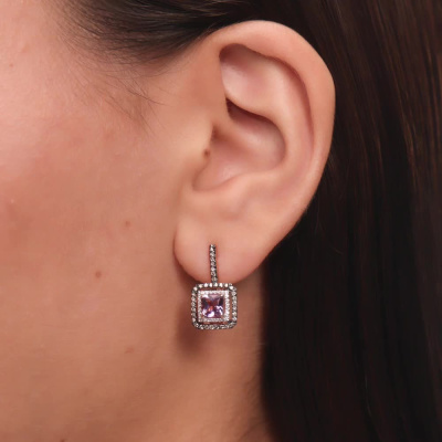 Серьги с 48 бриллиантами природными, 0.1 карат, огранка круг 17 граней, цвет 2, чистота 2, тип огранки А; 2 аметистами природными, 1.16 карат; 70 бриллиантами коньячными природными, 0.27 карат, огранка круг 57 граней, цвет 7, чистота 5, тип огранки А; Розовое золото 585 пробы.