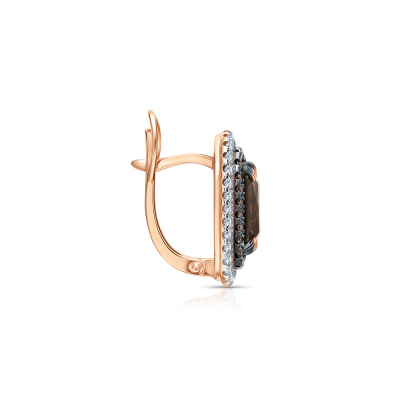 Серьги с 72 бриллиантами природными, 0.46 карат, огранка круг 17 граней, цвет 2, чистота 2, тип огранки А; 2 кварцами дымчатыми природными, 3.6 карат; 56 бриллиантами коньячными природными, 0.36 карат, огранка круг 57 граней, цвет 7, чистота 6, тип огранки А; Розовое золото 585 пробы.