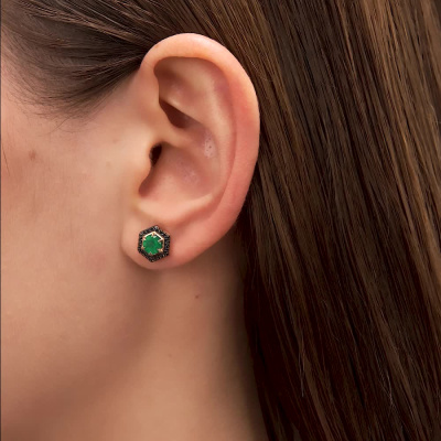 Серьги с 48 бриллиантами черными природными облагороженными, 0.12 карат, огранка круг 57 граней, цвет 7, чистота 6, тип огранки А; 2 агатами зелеными природными, огранка круг чекер; Розовое золото 585 пробы.