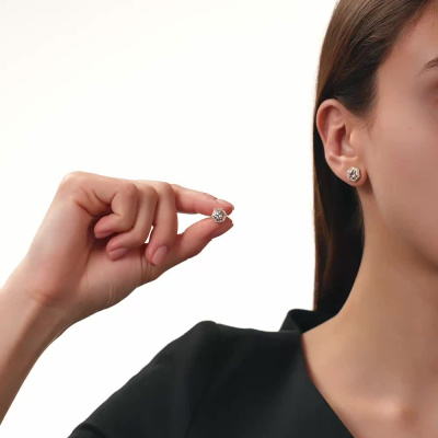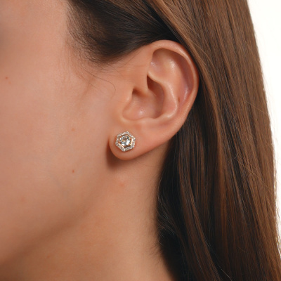 Серьги с 48 бриллиантами природными, 0.11 карат, огранка круг 17 граней, цвет 2, чистота 2, тип огранки А; 2 топазами скай природными, 1.07 карат, огранка круг чекер; Розовое золото 585 пробы.