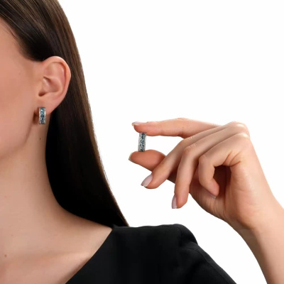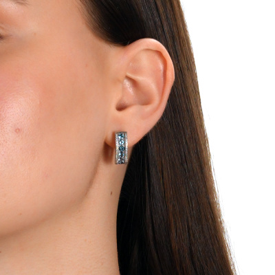 Серьги с 72 бриллиантами природными, 0.17 карат, огранка круг 17 граней, цвет 2, чистота 2, тип огранки А; 12 топазами лондон природными, 1.52 карат; Белое золото 585 пробы.