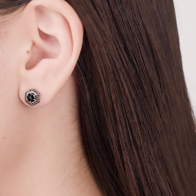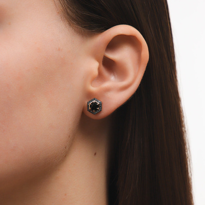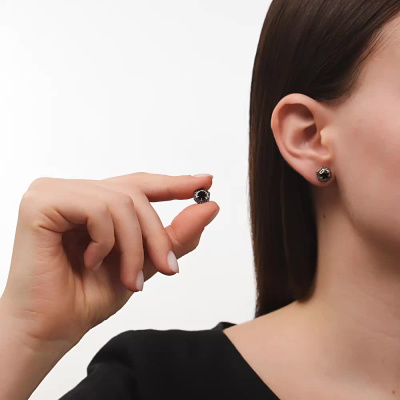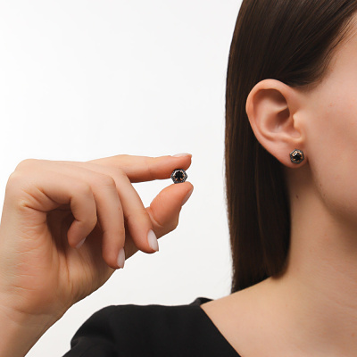 Серьги с 48 бриллиантами черными природными облагороженными, 0.12 карат, огранка круг 57 граней, цвет 7, чистота 6, тип огранки А; 2 агатами черными природными, огранка круг чекер; Розовое золото 585 пробы.