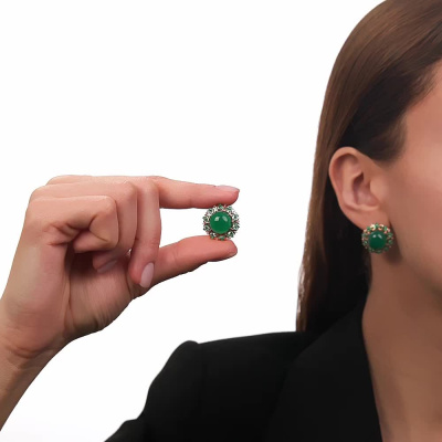 Серьги с 20 бриллиантами природными, 0.08 карат, огранка круг 17 граней, цвет 2, чистота 2, тип огранки А; 20 изумрудами природными, 0.37 карат, цвет 3, чистота 3, тип огранки В; 40 изумрудами природными, 0.5 карат, цвет 3, чистота 3, тип огранки В; 2 агатами зелеными природными; Розовое золото 585 пробы.