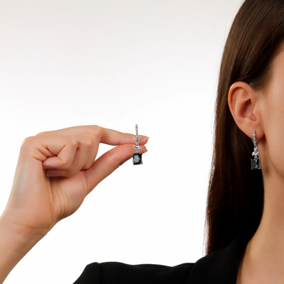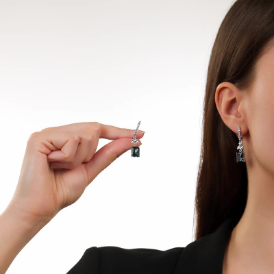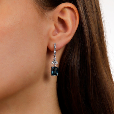 Серьги с 2 топазами лондон природными, 7.44 карат; 4 сапфирами бесцветными природными, 0.62 карат; 4 сапфирами бесцветными природными, 0.33 карат; 12 сапфирами бесцветными природными, 0.21 карат; Белое золото 585 пробы.