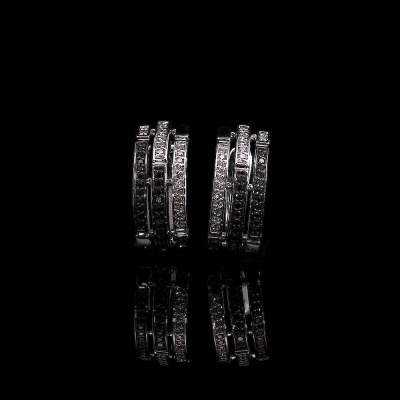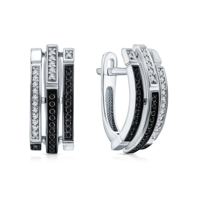 Серьги с 34 бриллиантами природными, 0.12 карат, огранка круг 57 граней, цвет 4, чистота 5, тип огранки А; 44 бриллиантами черными природными облагороженными, 0.21 карат, огранка круг 57 граней, цвет 7, чистота 6, тип огранки А; Белое золото 585 пробы.
