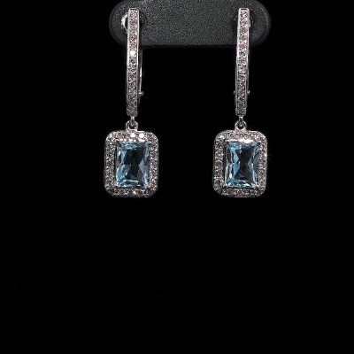 Серьги с 4 бриллиантами природными, 0.05 карат, огранка круг 57 граней, цвет 4, чистота 6, тип огранки А; 40 бриллиантами природными, 0.31 карат, огранка круг 57 граней, цвет 4, чистота 6, тип огранки А; 28 бриллиантами природными, 0.11 карат, огранка круг 57 граней, цвет 4, чистота 6, тип огранки А; 2 топазами скай природными, 2.51 карат; Белое золото 585 пробы.