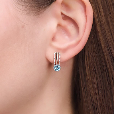 Серьги с 36 бриллиантами природными, 0.15 карат, огранка круг 17 граней, цвет 2, чистота 2, тип огранки А; 2 топазами свисс природными, 1.82 карат; Розовое золото 585 пробы.