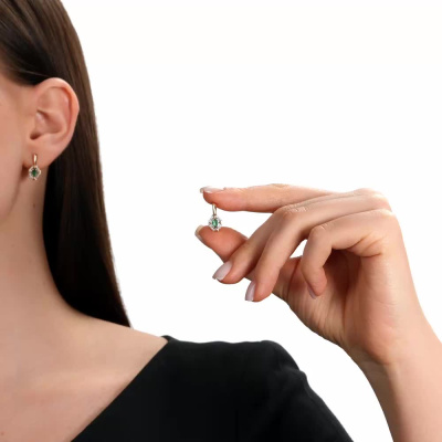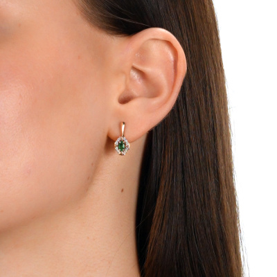 Серьги с 24 бриллиантами природными, 0.07 карат, огранка круг 57 граней, цвет 4, чистота 5, тип огранки А; 2 изумрудами природными, 0.4 карат, цвет 3, чистота 3, тип огранки Б; Розовое золото 585 пробы.
