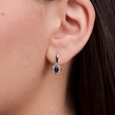 Серьги с 24 бриллиантами природными, 0.09 карат, огранка круг 57 граней, цвет 4, чистота 5, тип огранки А; 2 сапфирами природными, 0.62 карат, цвет 2, чистота 2, тип огранки Б; Белое золото 585 пробы.