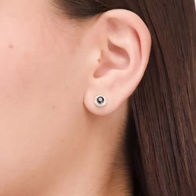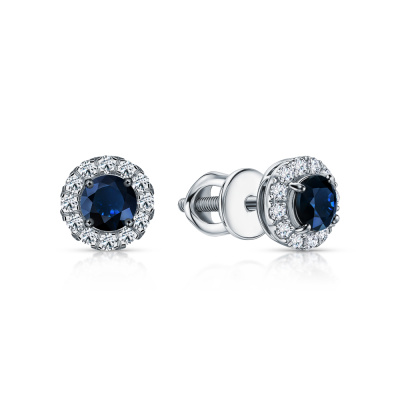 Серьги с 24 бриллиантами природными, 0.22 карат, огранка круг 17 граней, цвет 2, чистота 3; 2 сапфирами природными, 0.67 карат, цвет 3, чистота 4; Белое золото 585 пробы.