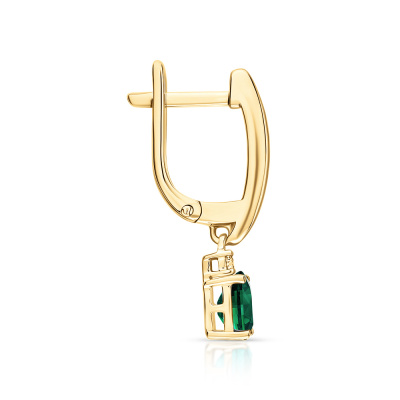 Серьги с 2 бриллиантами природными, 0.05 карат, огранка круг 57 граней, цвет 3, чистота 6; 2 изумрудами природными, 0.85 карат, цвет 4, чистота 3; Желтое золото 585 пробы.