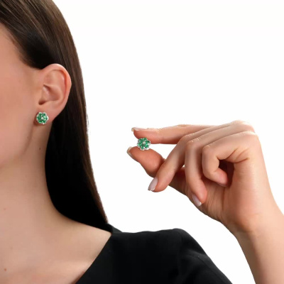 Серьги с 2 бриллиантами природными, 0.03 карат, огранка круг 57 граней, цвет 3, чистота 6; 56 бриллиантами природными, 0.34 карат, огранка круг 17 граней, цвет 2, чистота 3; 12 изумрудами природными, 1.81 карат, цвет 4, чистота 3; Желтое золото 585 пробы.