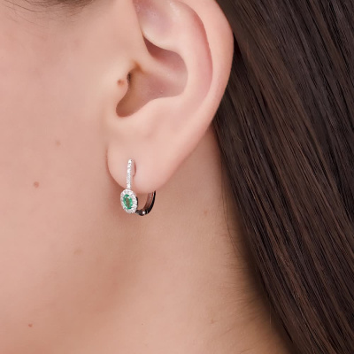Серьги с 34 бриллиантами природными, 0.2 карат, огранка круг 17 граней, цвет 2, чистота 3, тип огранки Б; 2 изумрудами природными, 0.31 карат, цвет 4, чистота 3, тип огранки Б; Белое золото 585 пробы.