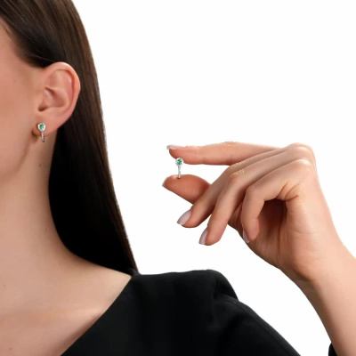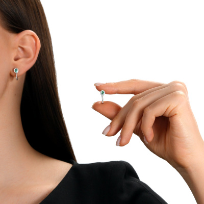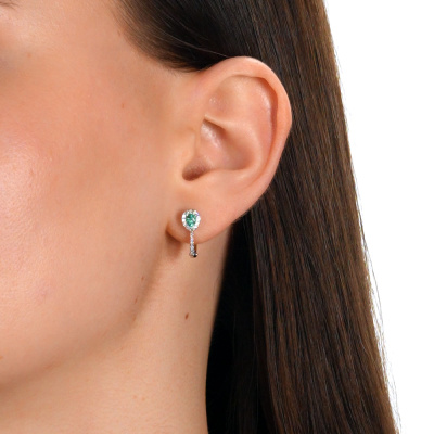 Серьги с 36 бриллиантами природными, 0.19 карат, огранка круг 17 граней, цвет 2, чистота 3; 2 изумрудами природными, 0.26 карат, цвет 4, чистота 3; Белое золото 585 пробы.