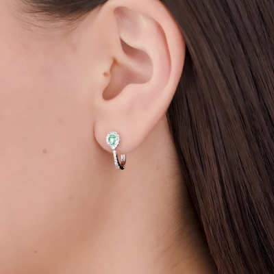 Серьги с 36 бриллиантами природными, 0.19 карат, огранка круг 17 граней, цвет 2, чистота 3, тип огранки Б; 2 изумрудами природными, 0.26 карат, цвет 4, чистота 3, тип огранки Б; Белое золото 585 пробы.