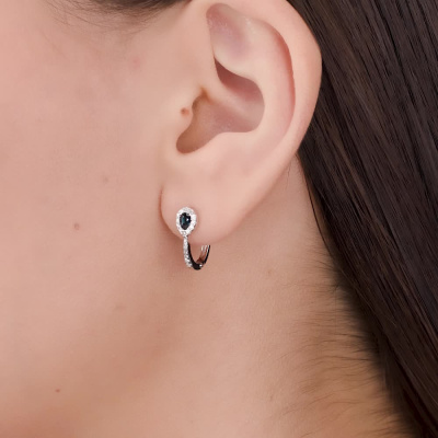 Серьги с 36 бриллиантами природными, 0.19 карат, огранка круг 17 граней, цвет 2, чистота 3; 2 сапфирами природными, 0.4 карат, цвет 3, чистота 4; Белое золото 585 пробы.
