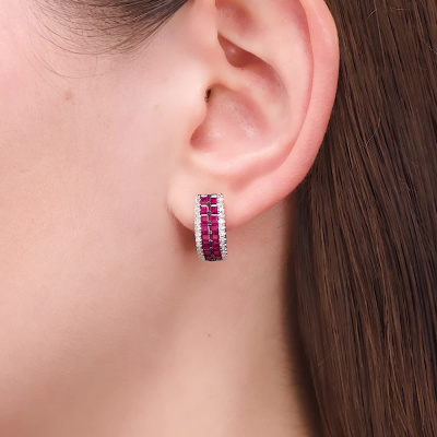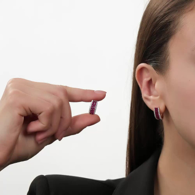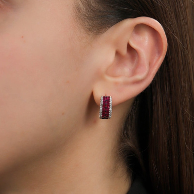 Серьги с 52 бриллиантами природными, 0.34 карат, огранка круг 17 граней, цвет 2, чистота 3; 32 рубинами природными, 2.15 карат, цвет 3, чистота 4; Розовое золото 585 пробы.