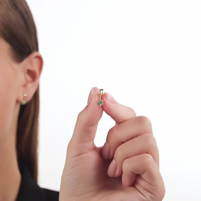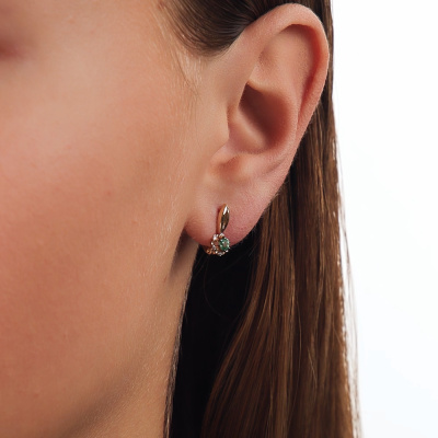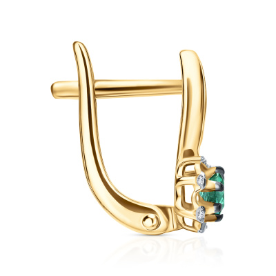 Серьги с 12 бриллиантами природными, 0.03 карат, огранка круг 17 граней, цвет 2, чистота 3; 2 изумрудами природными, 0.16 карат, цвет 4, чистота 3; Желтое золото 585 пробы.