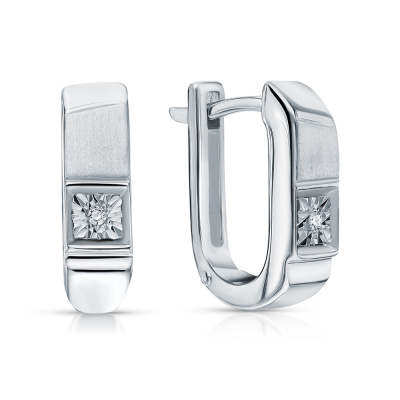 Серьги с 2 бриллиантами природными, 0.009 карат, огранка круг 17 граней, цвет 2, чистота 3, тип огранки А; Серебро 925 пробы.
