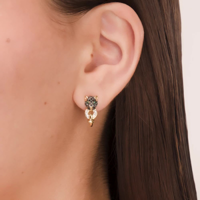 Серьги с 12 бриллиантами природными, 0.04 карат, огранка круг 17 граней, цвет 2, чистота 3, тип огранки А; 4 бриллиантами черными природными облагороженными, 0.03 карат, огранка круг 57 граней, цвет 7, чистота 6, тип огранки А; 38 бриллиантами черными природными облагороженными, 0.17 карат, огранка круг 57 граней, цвет 7, чистота 6, тип огранки А; 4 изумрудами природными, 0.01 карат, цвет 3, чистота 3, тип огранки Б; Желтое золото 585 пробы.