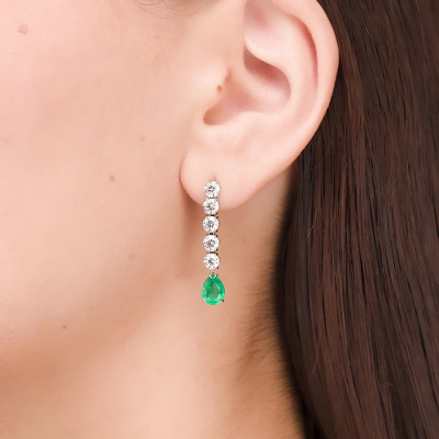 Серьги с 10 бриллиантами природными, 2.55 карат, огранка круг 57 граней, цвет 3, чистота 6, тип огранки А; 2 изумрудами природными, 1.87 карат, цвет 3, чистота 3, тип огранки Б; Белое золото 585 пробы.