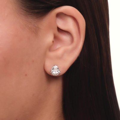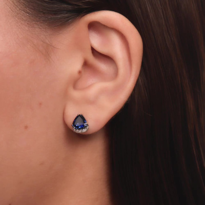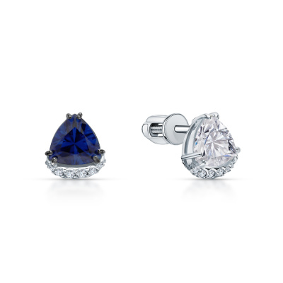 Серьги с 4 бриллиантами природными, 0.04 карат, огранка круг 57 граней, цвет 3, чистота 6, тип огранки А; 4 бриллиантами природными, 0.03 карат, огранка круг 57 граней, цвет 3, чистота 6, тип огранки А; 4 бриллиантами природными, 0.01 карат, огранка круг 17 граней, цвет 2, чистота 2, тип огранки А; 1 сапфиром синтетическим, 1.53 карат; 1 топазом бесцветным природным, 1.32 карат; Белое золото 585 пробы.