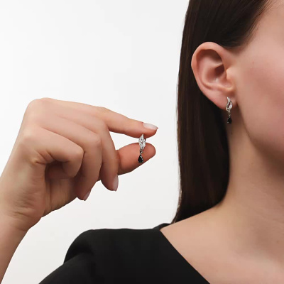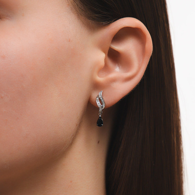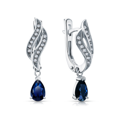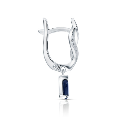 Серьги с 28 бриллиантами природными, 0.11 карат, огранка круг 17 граней, цвет 2, чистота 2, тип огранки А; 2 сапфирами природными, 0.89 карат, цвет 2, чистота 2, тип огранки Б; Белое золото 585 пробы.