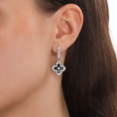 Серьги с 2 бриллиантами природными, 0.06 карат, огранка круг 57 граней, цвет 3, чистота 6, тип огранки А; 24 бриллиантами природными, 0.15 карат, огранка круг 57 граней, цвет 3, чистота 6, тип огранки А; 32 бриллиантами природными, 0.13 карат, огранка круг 17 граней, цвет 2, чистота 2, тип огранки А; 52 бриллиантами природными, 0.14 карат, огранка круг 17 граней, цвет 2, чистота 2, тип огранки А; 8 сапфирами природными, 1.69 карат, цвет 5, чистота 3, тип огранки Б; Белое золото 585 пробы.