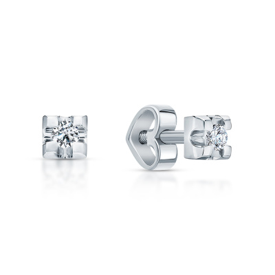 Серьги с 2 бриллиантами природными, 0.09 карат, огранка круг 57 граней, цвет 3, чистота 6, тип огранки А; Белое золото 585 пробы.