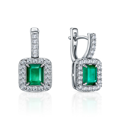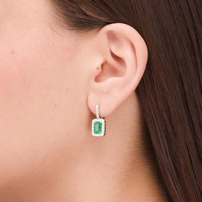 Серьги с 46 бриллиантами природными, 0.61 карат, огранка круг 57 граней, цвет 3, чистота 6, тип огранки А; 2 изумрудами природными, 1.62 карат, цвет 3, чистота 3, тип огранки Б; Белое золото 585 пробы.
