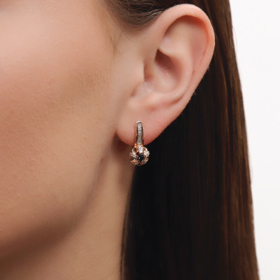 Серьги с 44 бриллиантами природными, 0.18 карат, огранка круг 17 граней, цвет 2, чистота 2, тип огранки А; 2 сапфирами природными, 0.39 карат, цвет 2, чистота 2, тип огранки В; Розовое золото 585 пробы.
